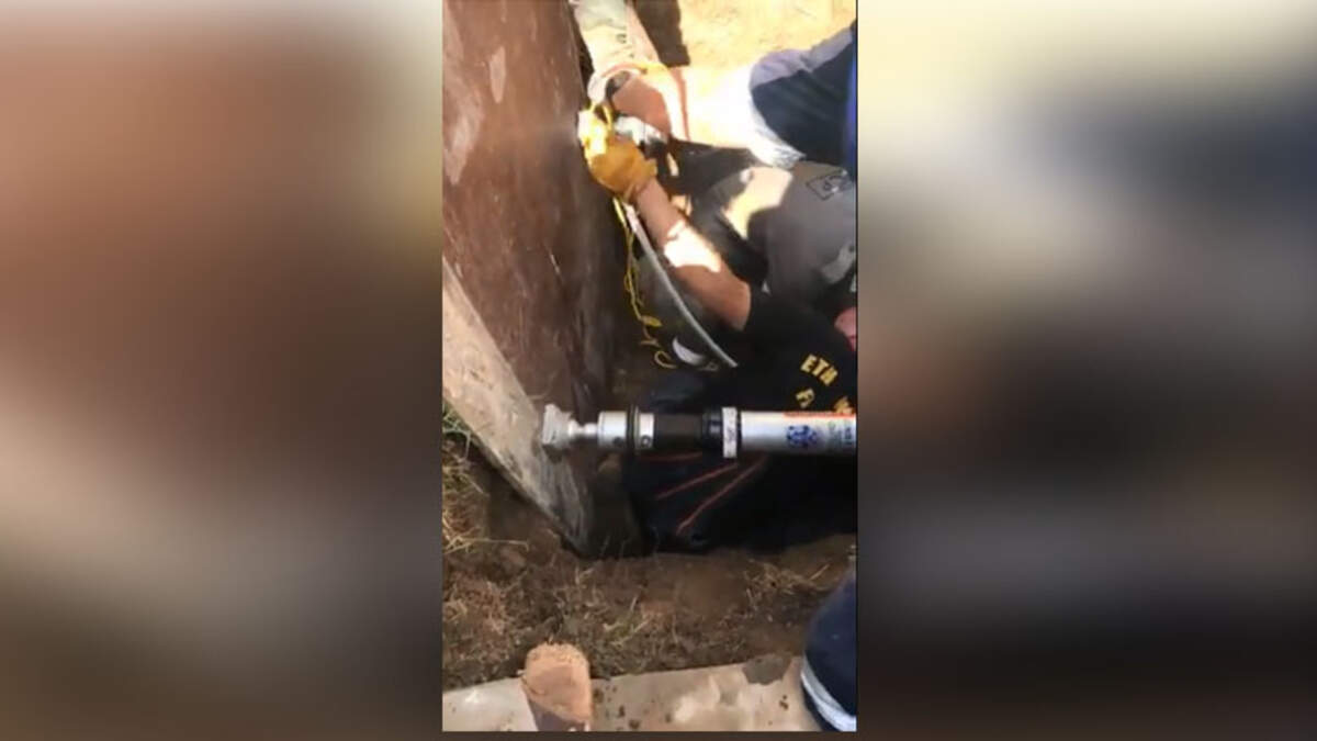 The rescue crew had to use a chisel and hammer to break the drain in order to extract the newborn. It took them nearly four hours to get the infant out of the pipe. Video captured the dramatic moment when workers pulled the newborn from the drain.