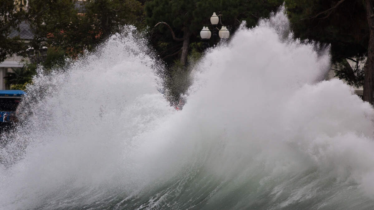 Mike Bettes, the host of Weather Underground on The Weather Channel, posted "rare" footage of a dangerous storm surge sweeping through Fort Myers Beach, Florida. The meteorologist says the camera is six feet off the ground on Estero Boulevard. Video shows huge waves battering the camera as trees and poles waver from the hurricane-force winds.